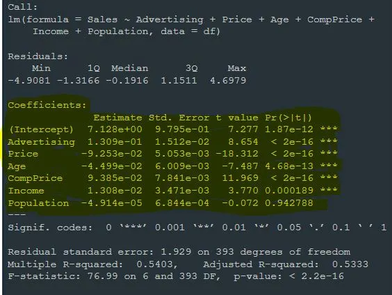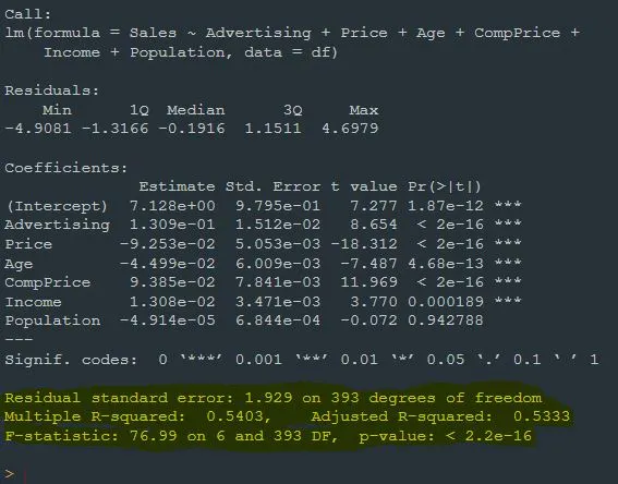 model <- lm(Sales~Advertising+Price+Age+CompPrice+Income+Population,data=df)